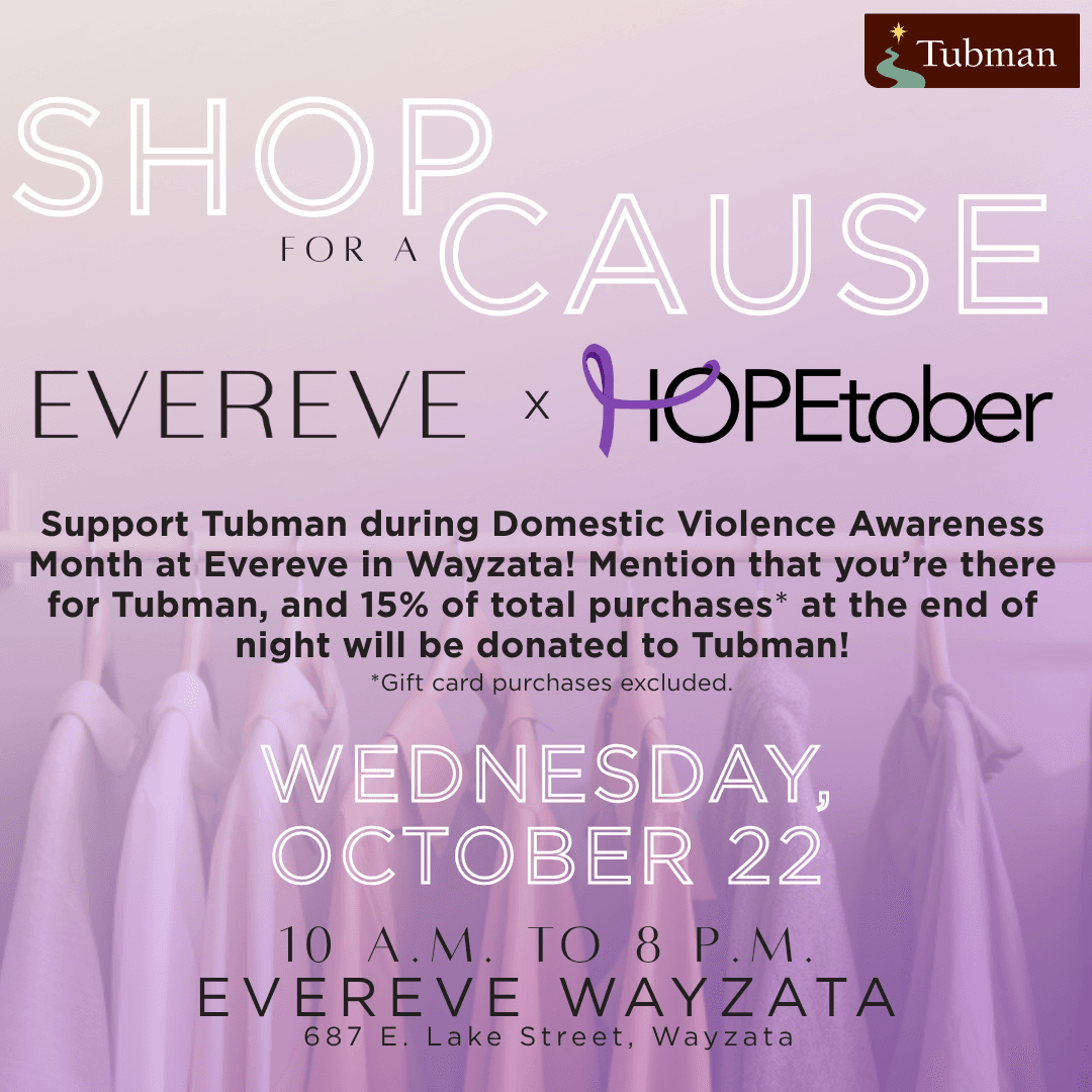 Support HOPEtober with Shop for Cause at EVEREVE Wayzata on Wednesday, October 22, 2025. From 10 a.m. to 8 p.m. mention you are there for Tubman or HOPEtober, and 15% of total sales from the day will be donated back.